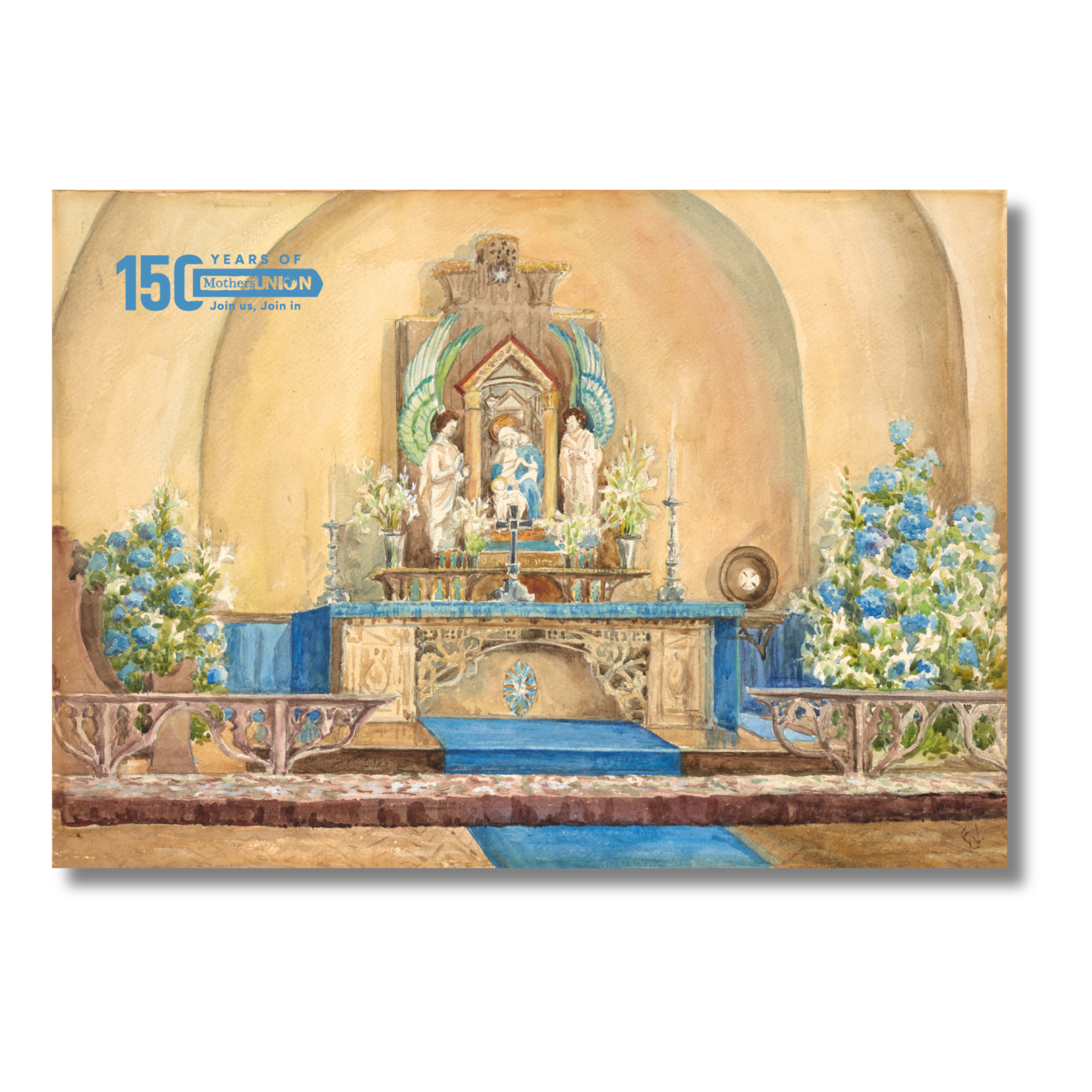 A lovely watercolour illustration of the Mary Sumner House Chapel (circa 1926). Features the 150th Anniversary logo.
