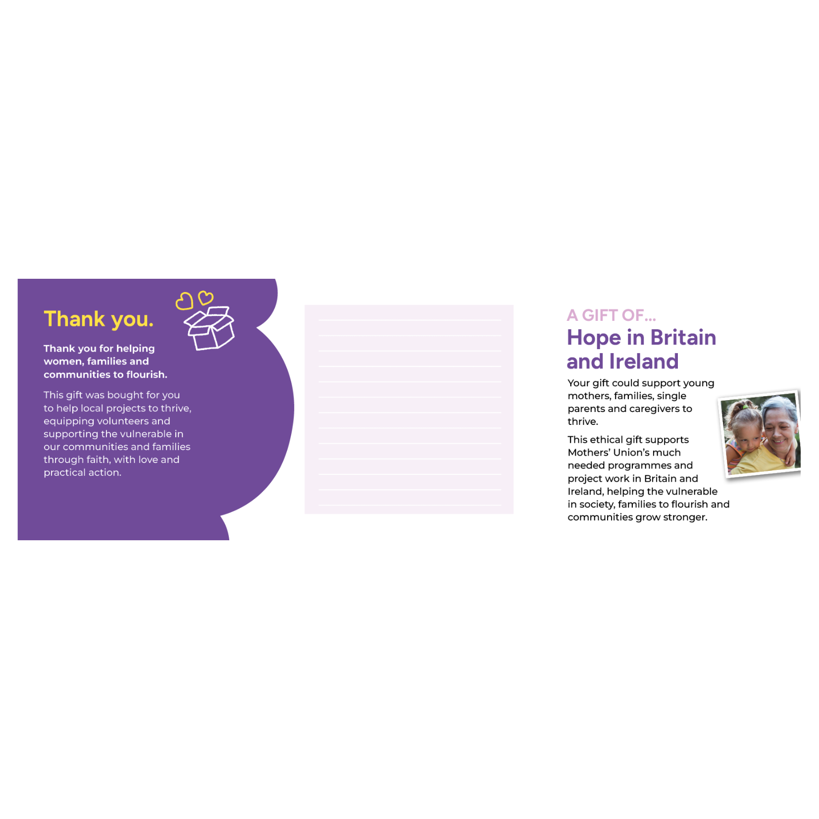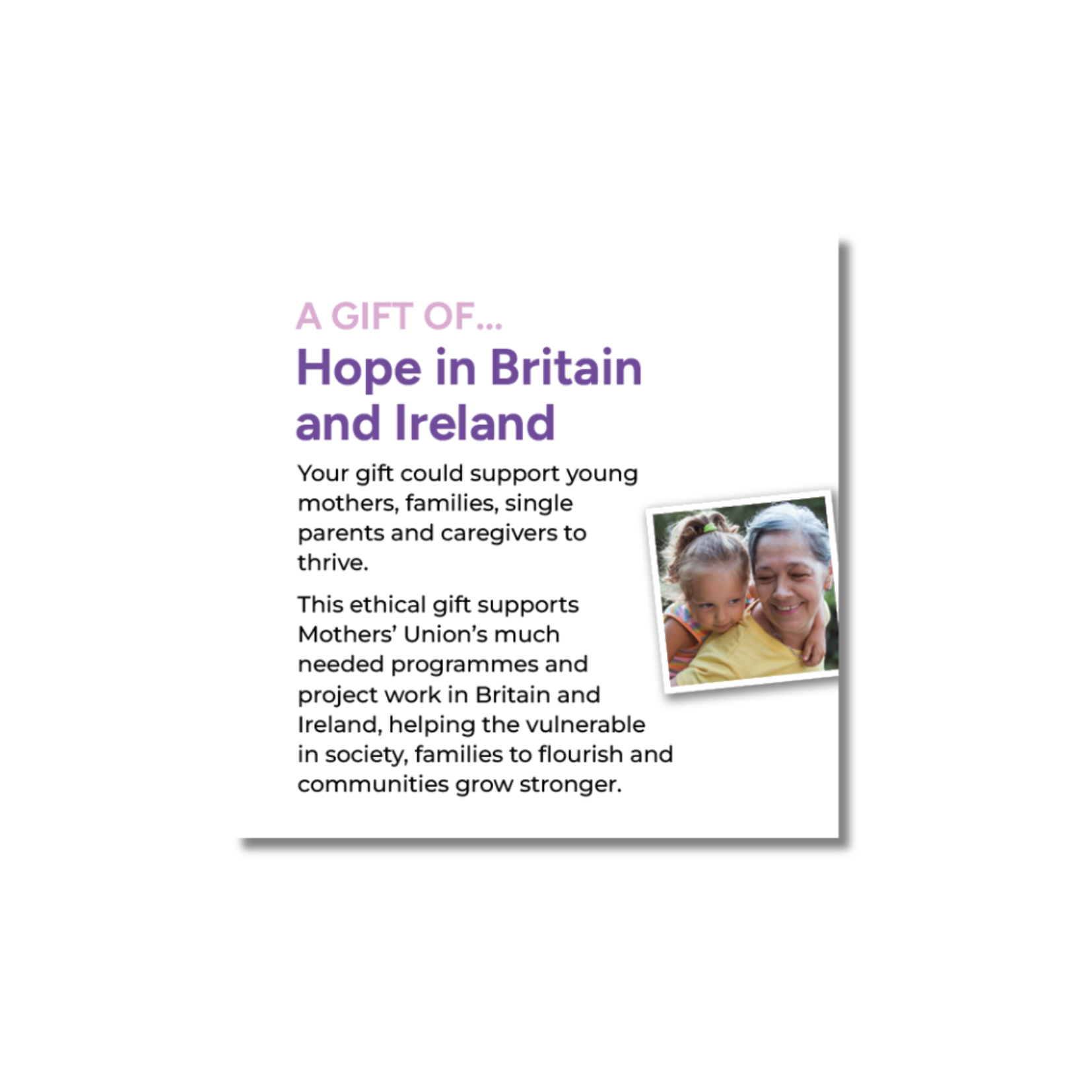 This ethical gift supports Mothers’ Union’s much needed programmes and project work in Britain and Ireland, helping the vulnerable in society, families to flourish and communities grow stronger.