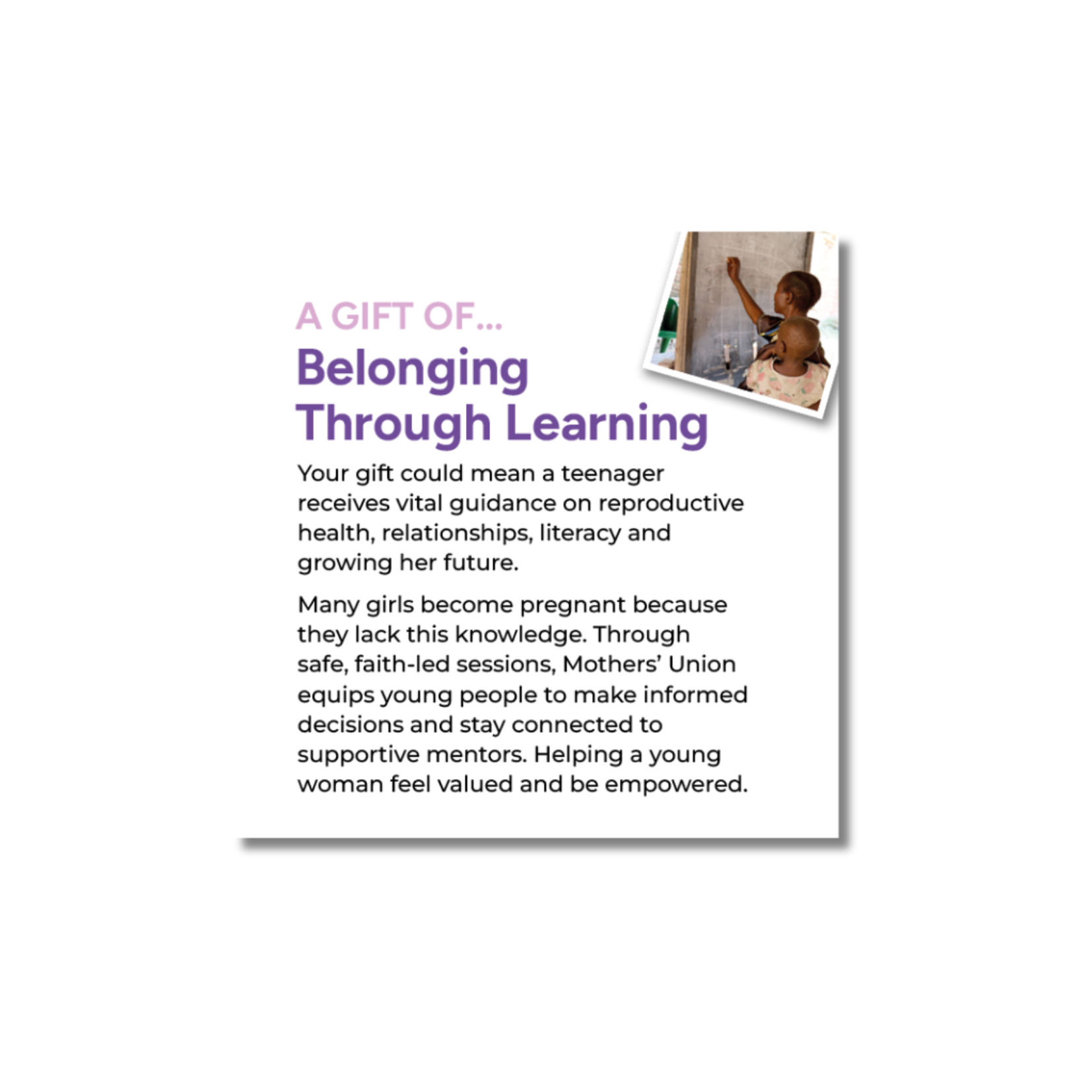 Many girls become pregnant because they lack this knowledge. Through safe, faith-led sessions, Mothers’ Union equips young people to make informed decisions and stay connected to supportive mentors. Helping a young woman feel valued and be empowered.