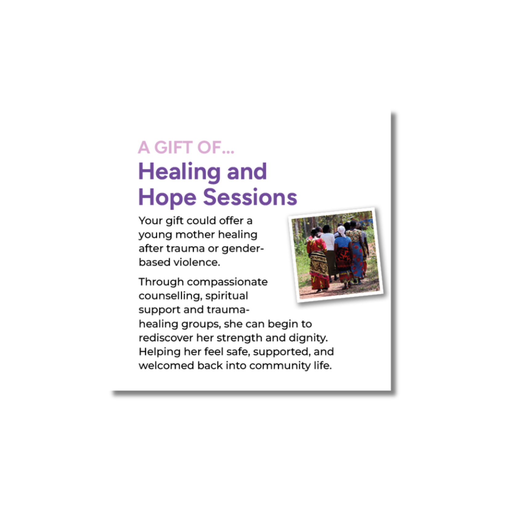 Through compassionate counselling, spiritual support and trauma-healing groups, she can begin to rediscover her strength and dignity. Helping her feel safe, supported, and welcomed back into community life.